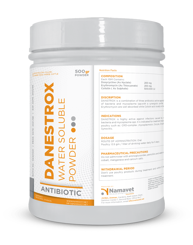 DANSTROX is highly active against infections caused by various strains of bacteria and mycoplasma spp. it is indicated for treating of respiratory diseases in poultry such as CRD-complex , mycoplasmosis, Coryza, Sinusitis, and Infectious Synovitis.