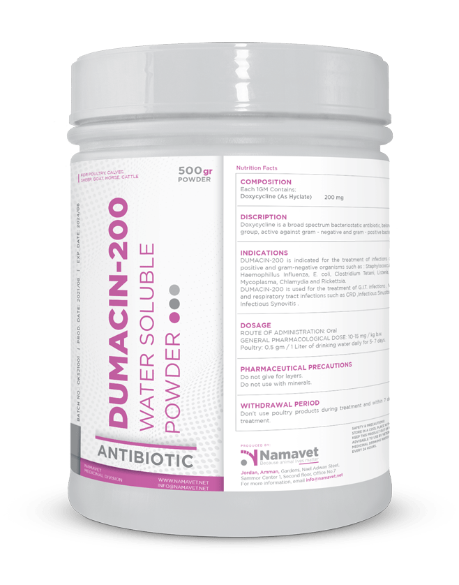 DUMACIN-200 is used for the treatment of G.I.T. infections , Necrotic Entetritis and respiratory tract infections such as CRD , Infectious Sinusitis, Air Saculitis and Infectious Synovitis .